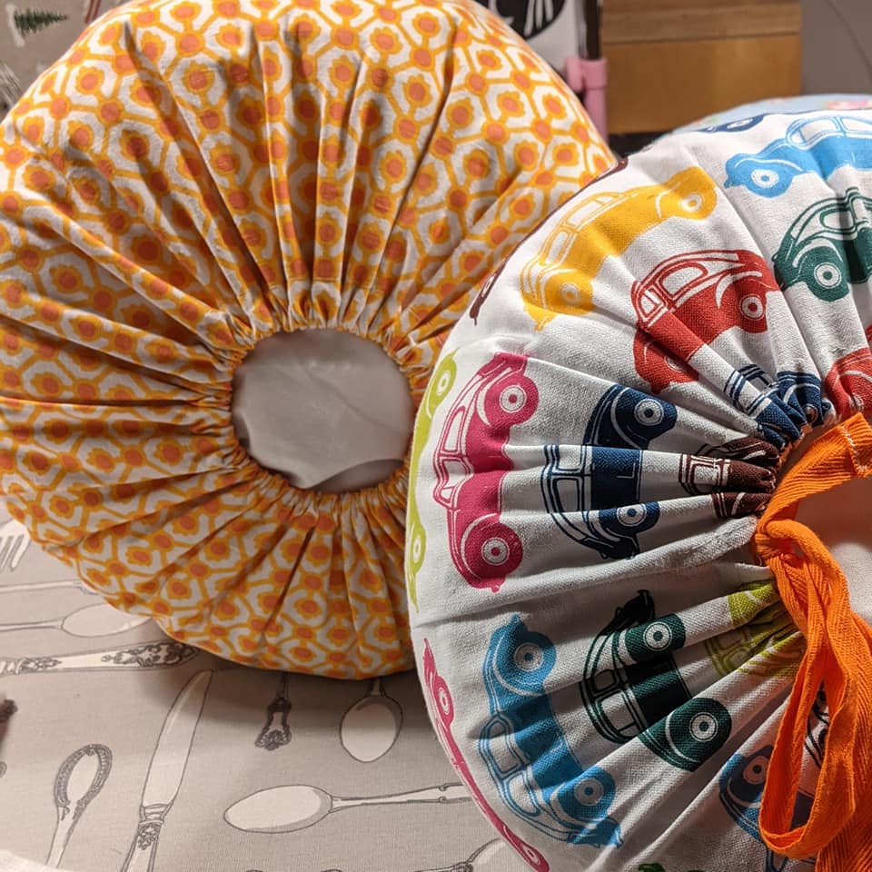 For children aged from 1 who can walk. They are stuffed with organic fleece and jersey waste from my friend's children's clothing business. Draw string closure. The covers are washable, made from offcuts from my stash or you can provide fabric 110 x 70 cms.